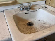 戸建住宅の1階洗面所のおそうじです。長期間にわたって使用されておらず、カビや水垢、ほこりが多い状態でしたが、作業スタッフ1名による清掃作業で清潔で快適な状態となりました。